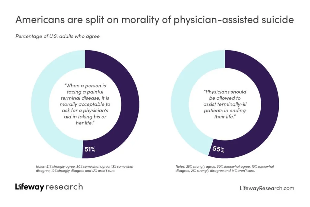While 51 percent of Americans agree with the morality of physician-assisted suicide, just 21 percent strongly agree. Another third (32 percent) disagree, and 17 percent aren’t sure, according to Lifeway Research.