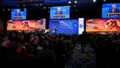 Anti-Israel activists protested outside the Christians United for Israel conference near Washington, D.C., in late July. “We cannot call ourselves…